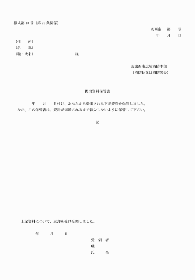 3 提出された資料で保管の必要がなくなったときは、提出資料保管書(様式第13号)と引換えに関係者にこれを返還し、受領した旨の署名をもらうものとする。
