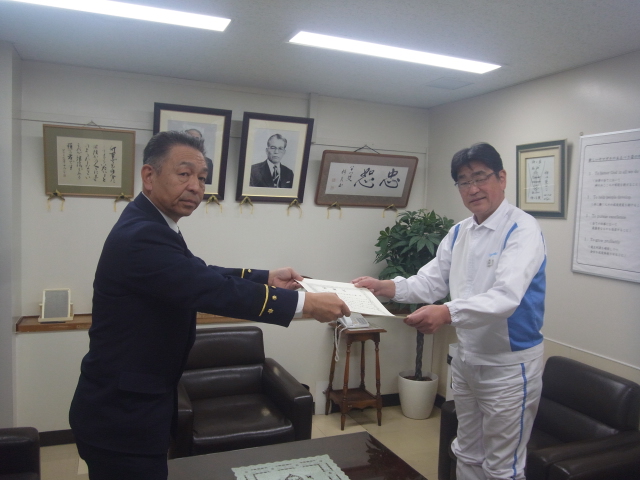 この度、当消防本部の災害活動において多大なる貢献を頂きました山崎製パン株式会社古河工場様に対し、心より感謝の意を込めて感謝状を贈呈いたしました。